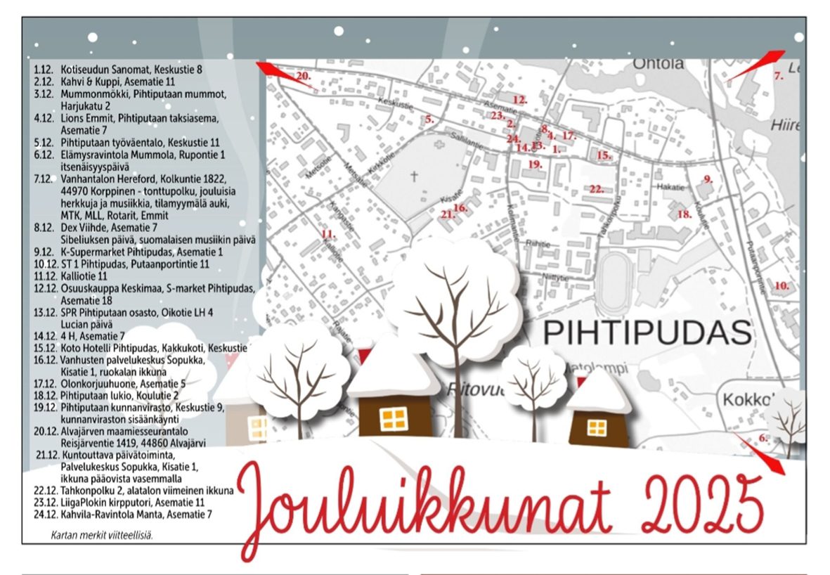 Jokainen päivä 1.-24.12.25 klo 9 paljastuu uusi joulukalenteri-ikkuna oheisen kartan mukaan.