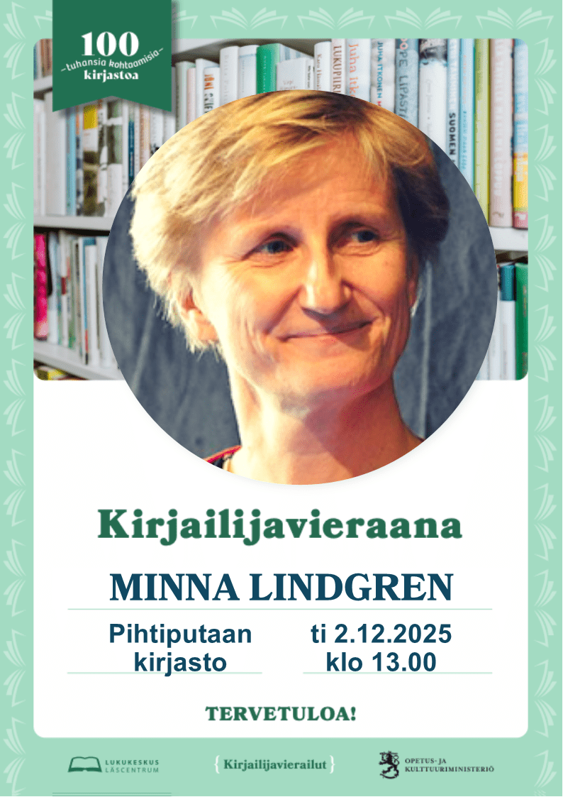 Kirjailijavieraana Minna Lindgren. 100 kirjastoa – tuhansia kohtaamisia on vuoden suurin kirjailijakiertue. Opetus – ja kulttuuriministeriön rahoittamassa hankkeessa järjestetään 100 kirjailijavierailua kirjastoissa ympäri Suomen vuoden 2025 aikana. Kirjailijavierailuja koordinoi Lukukeskus.