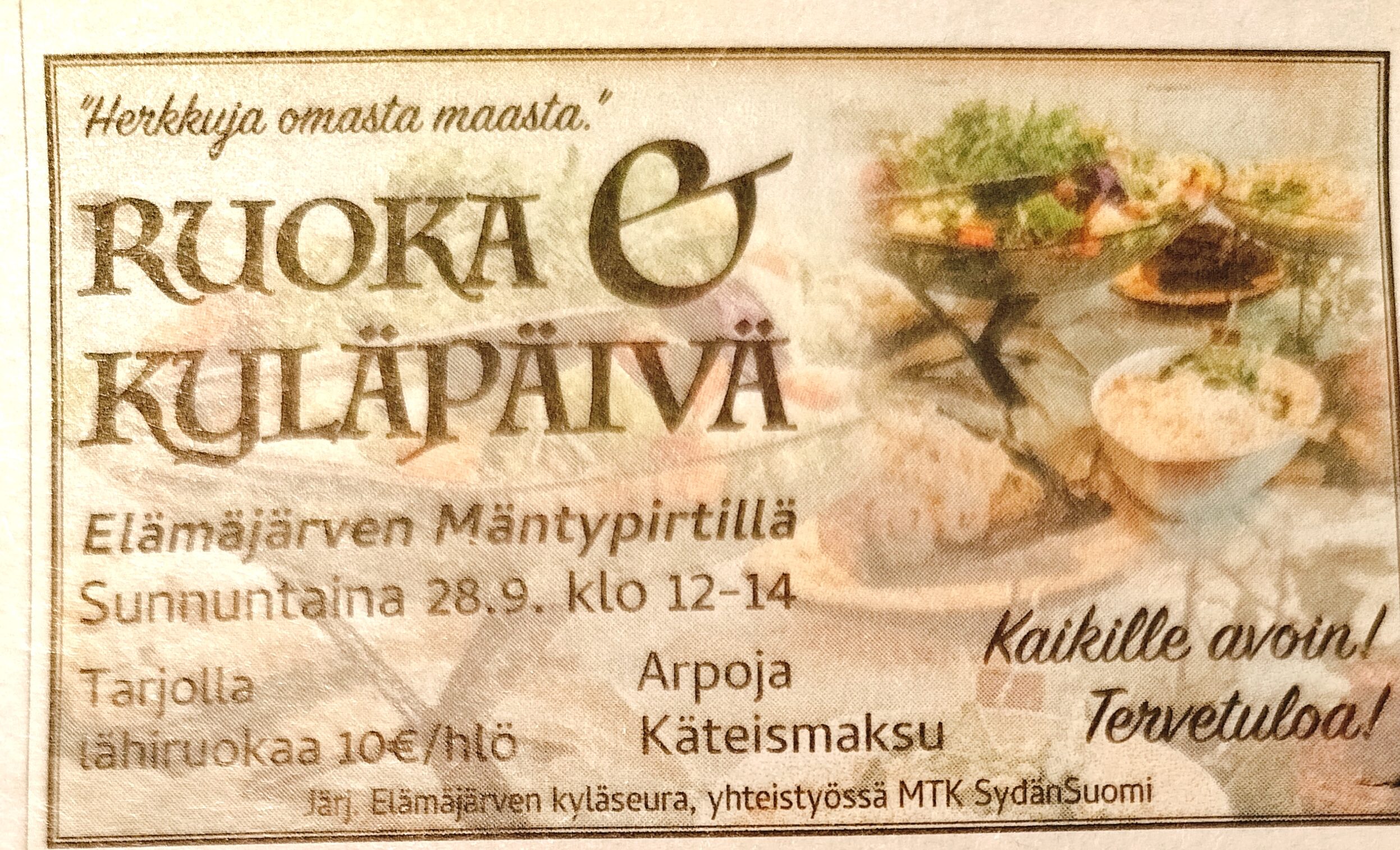 Kaikille avoin Herkkuja omasta maasta ruoka- ja kyläpäivä. Tarjolla lähiruokaa 10€/ hlö, arpoja.