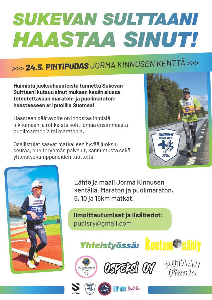 Huimista juoksuhaasteista tunnettu Sukevan Sulttaani kutsuu sinut mukaan kesän alussa toteutettavaan maraton- ja puolimaratonhaasteeseen eri puolilla Suomea! Haasteen päätavoite on innostaa ihmisiä liikkumaan ja rohkaista kohti omaa ensimmäistä puolimaratonia tai maratonia. Osallistujat saavat matkalleen hyvää juoksuseuraa, huoltoryhmän palvelut, kannustusta sekä yhteistyökumppaneiden tuotteita.