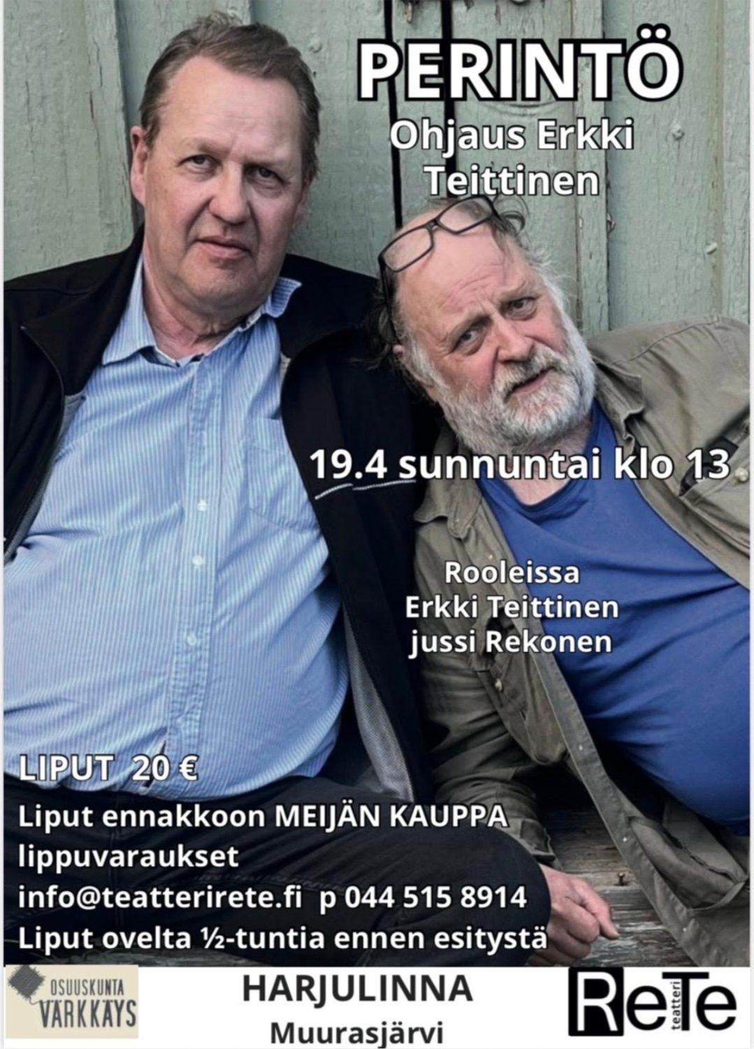 Perintö on lämminhenkinen ja humoristinen tarina kahdesta veljeksestä, jotka joutuvat kohtaamaan perheensä menneisyyden – ja sen, mitä todella jää perinnöksi. Mitä perintö oikeastaan tarkoittaa? Onko se talo ja traktori, pankkikirjat… Lue lisää »ReTe- teatterin esitys PERINTÖ