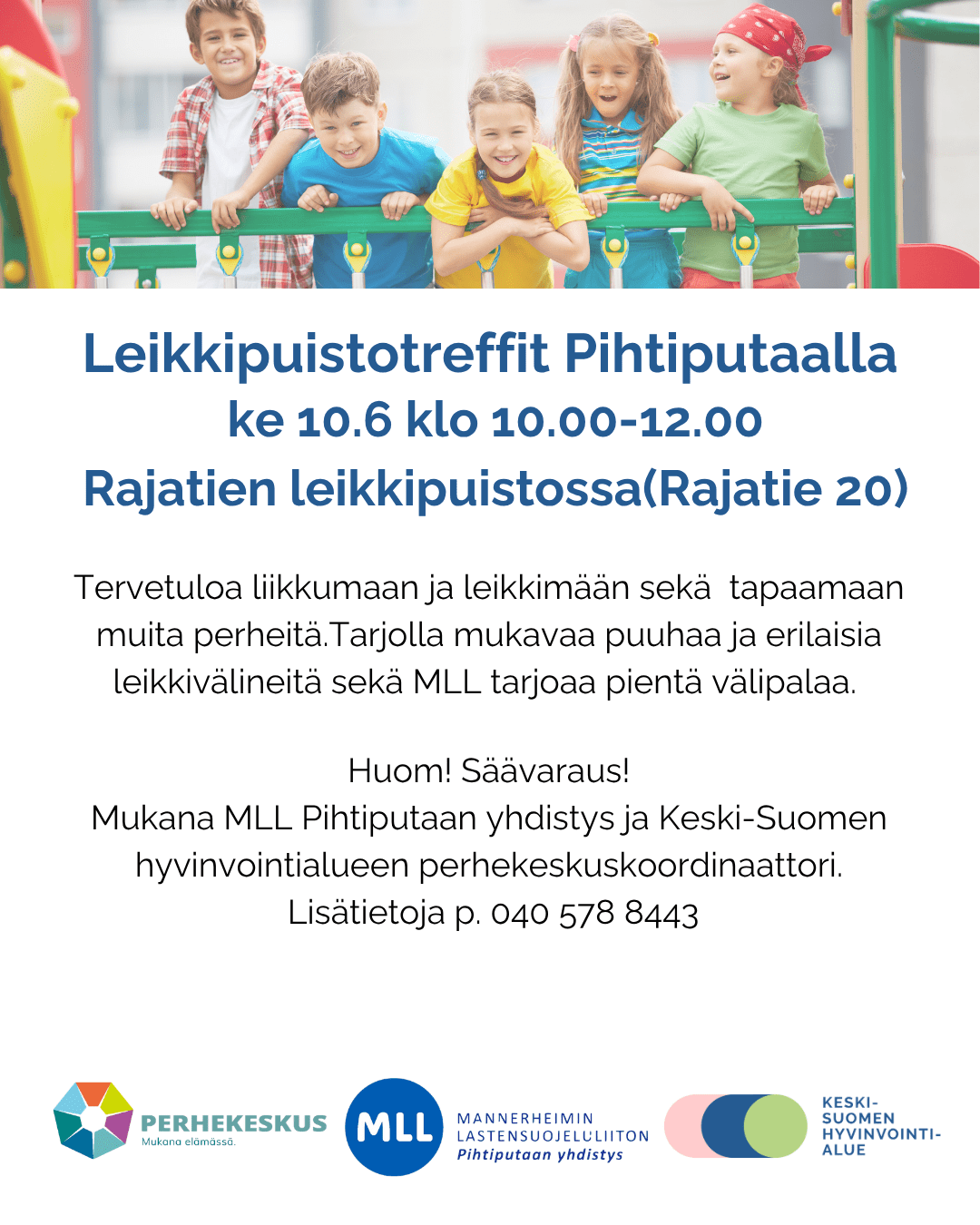Tervetuloa liikkumaan ja leikkimään sekä tapaamaan muita perheitä Rajatien leikkipuistoon! Tarjolla mukavaa puuhaa ja erilaisia leikkivälineitä sekä MLL Pihtiputaan yhdistys tarjoaa pientä välipalaa. Huom! Säävaraus. Mukana MLL Pihtiputaan yhdistys ja… Lue lisää »Leikkipuistotreffit
