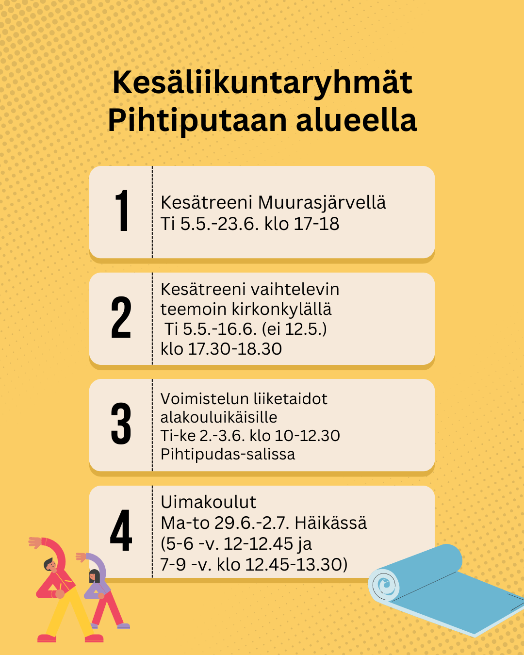 Kesäliikuntaryhmät Pihtiputaan alueella Kesätreeni MuurasjärvelläTi 5.5.–23.6. klo 17–18 Kesätreeni vaihtelevin teemoin kirkonkylälläTi 5.5.–16.6. (ei 12.5.)klo 17.30–18.30 Voimistelun liiketaidot alakouluikäisilleTi–ke 2.–3.6. klo 10–12.30Pihtipudas-salissa UimakoulutMa–to 29.6.–2.7. Häikäsässä(5–6 -v. 12–12.45 ja7–9 -v. klo… Lue lisää »Kansalaisopiston kesäkurssit