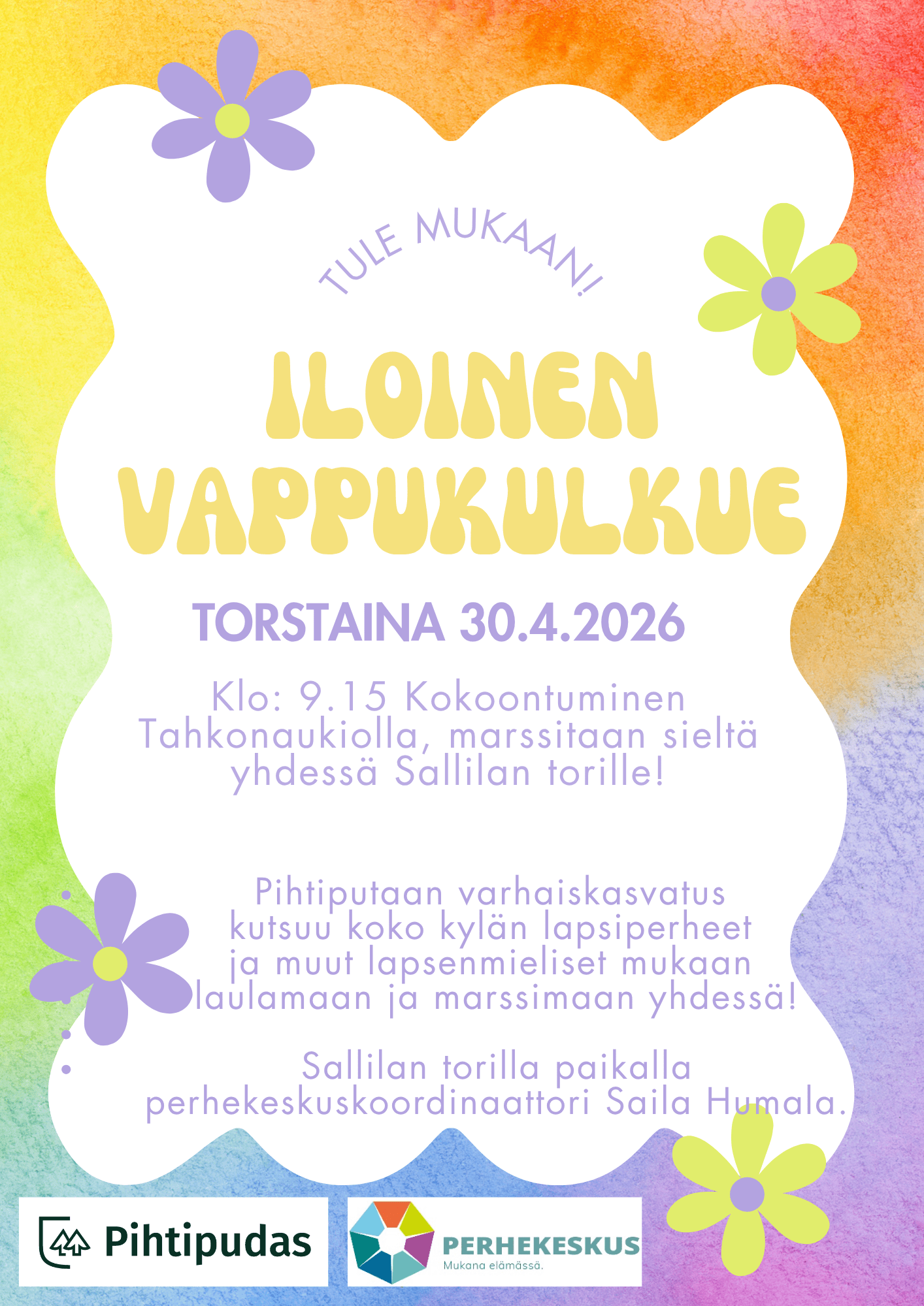 Pihtiputaan varhaiskasvatus kutsuu koko kylän lapsiperheet ja muut lapsenmieliset mukaan laulamaan ja marssimaan yhdessä! To 30.4.2026 Klo: 9.15 kokoontuminen Tahkonaukiolla, marssitaan sieltä yhdessä Sallilan torille! Sallilan torilla paikalla perhekeskuskoordinaattori Saila… Lue lisää »Vappukulkue