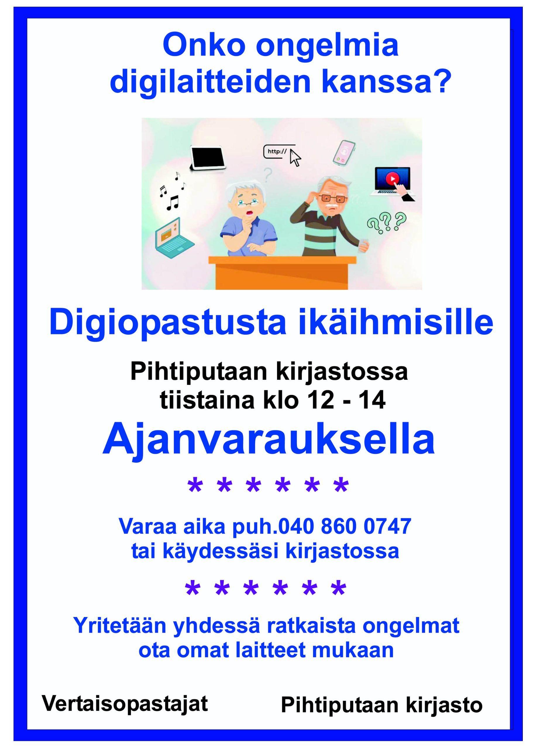 Onko ongelmia digilaitteiden kanssa? Digiopastusta ikäihmisille Pihtiputaan kirjastossa tiistaina klo 12. - 14. AJANVARAUKSELLA. Varaa aika puh. 040 860 0747 tai käydessäsi kirjastossa. Yritetään yhdessä ratkaisa ongelmat, ota omat laitteet… Lue lisää »Digiopastusta ikäihmisille