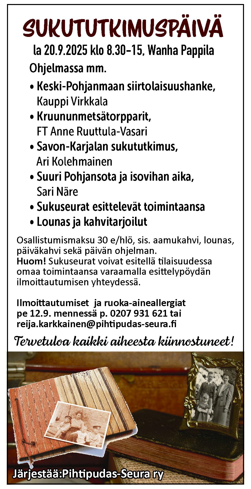 Pihtipudas-Seura  järjestää kaikille avoimen Sukututkimuspäivän. Paikalla asiantuntijoita pitämässä mielenkiintoisia sukututkimusaiheisia esityksiä. Myös sukuseurat ovat tervetulleita esittelemään toimintaansa. Osallistumismaksu 30€/hlö, sis. ohjelman, lounaan ja kahvitarjoilut. Ilmoittautumiset, mahdolliset ruoka-aineallergiat ja sukuseurojen paikkavaraukset… Lue lisää »Sukututkimuspäivä